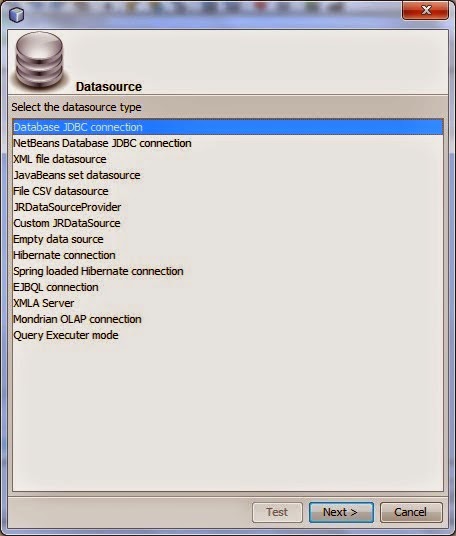 database,username dan password dari IReport ke PostgreSQL,dan setelah itu, cobalah untuk mengetes koneksi seperti gambar